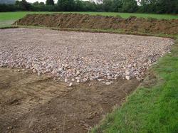 French Drains being laid : this involves laying a perforated plastic pipe in a trench, and covering it with 40mm ballast. The water will run off the concrete, into the ditch and pipe, and theends of the pipe are laid with a fall toward the ditch.